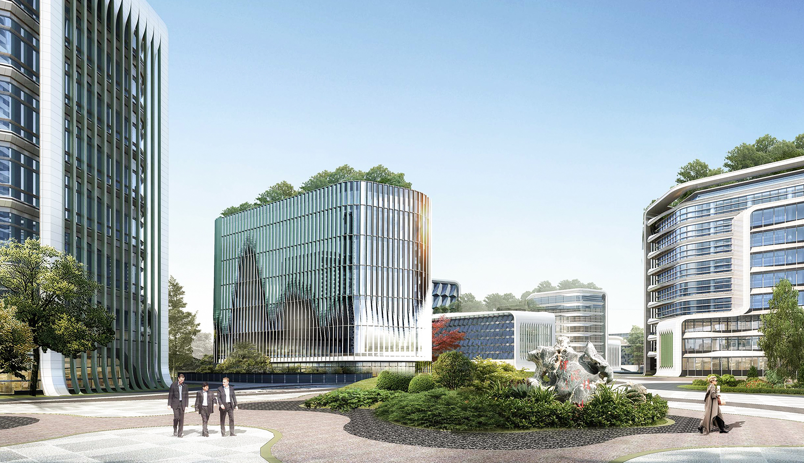規(guī)劃設(shè)計(jì)以“曲水流觴”為理念,空間布局取“曲水流觴”場(chǎng)景精髓,以曲徑通幽的景觀系統(tǒng)作為主軸,以組團(tuán)布局的院士樓為節(jié)點(diǎn),完成整個(gè)園區(qū)的規(guī)劃設(shè)計(jì)。布局貫穿南北的云游步道,曲徑通幽,步移景異,人在步道上行走,猶如流動(dòng)的羽觴杯,尋訪(fǎng)院士樓、穿行重重竹林、覓河濱綠地等景致,體會(huì)古代曲水流觴之儒風(fēng)雅俗。