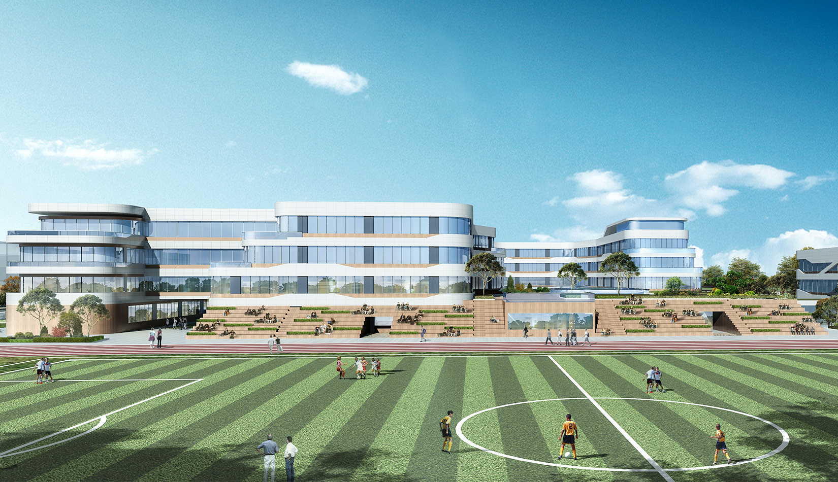 充滿綠化的連續(xù)平臺(tái)接通各教學(xué)樓,在東西南北方向形成內(nèi)院,由西向東側(cè)延伸,與操場(chǎng)融為一體,提供了良好的視覺(jué)穿透性。建筑風(fēng)格現(xiàn)代富有動(dòng)感,線條流暢,形成強(qiáng)烈的可識(shí)別性。