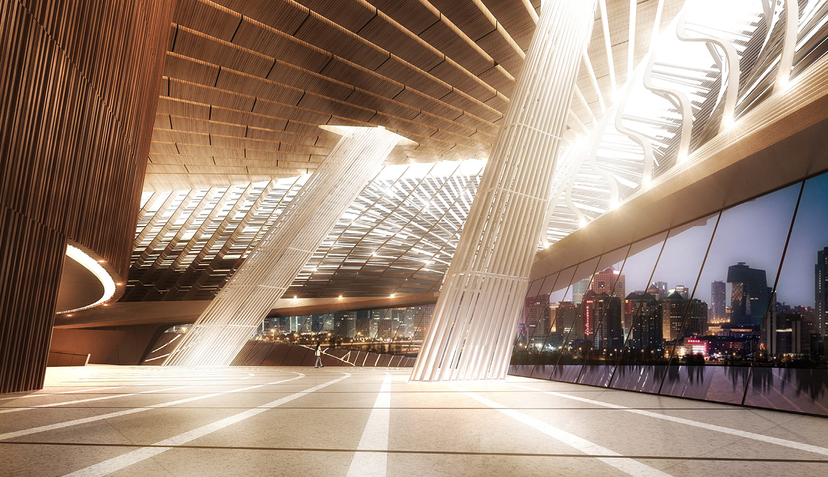 觀眾廳整體空間形態(tài)采用馬蹄形設(shè)計(jì),觀眾廳建聲采用聲學(xué)墻與裝飾墻結(jié)合的方式。延建筑東南部呈“U”型環(huán)繞觀眾廳布置,觀眾二層、三層休息廳設(shè)置吹拔,結(jié)合兩側(cè)連續(xù)坡道,構(gòu)成游走空間,將各層休息廳在空間上相互連通,并結(jié)合建筑表皮,形成莊重、典雅又不失生動(dòng)的空間體驗(yàn)。