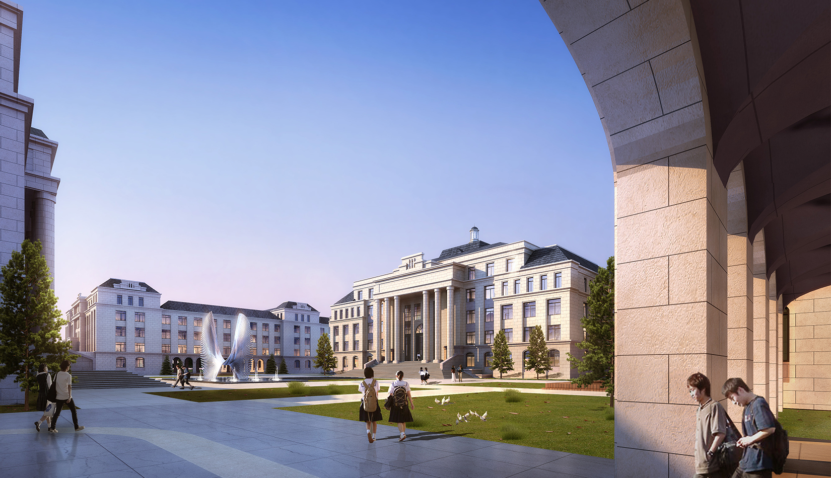 景觀設(shè)計(jì)引用了《禮記聘義》中對玉的六大特征:“禮”“知” “樂” “信”“義”“仁”作為景觀主題植入學(xué)校各個(gè)重要空間。
