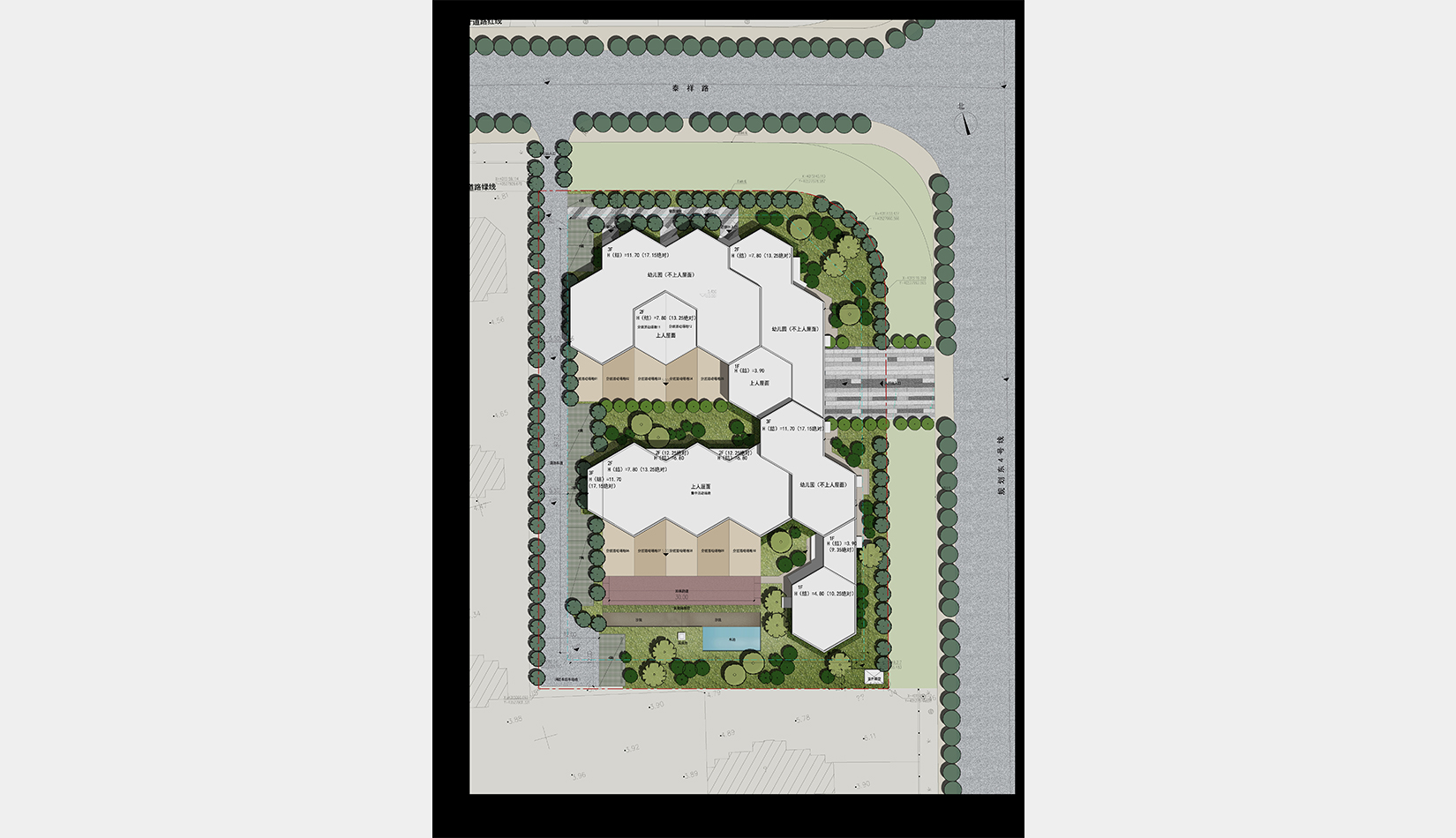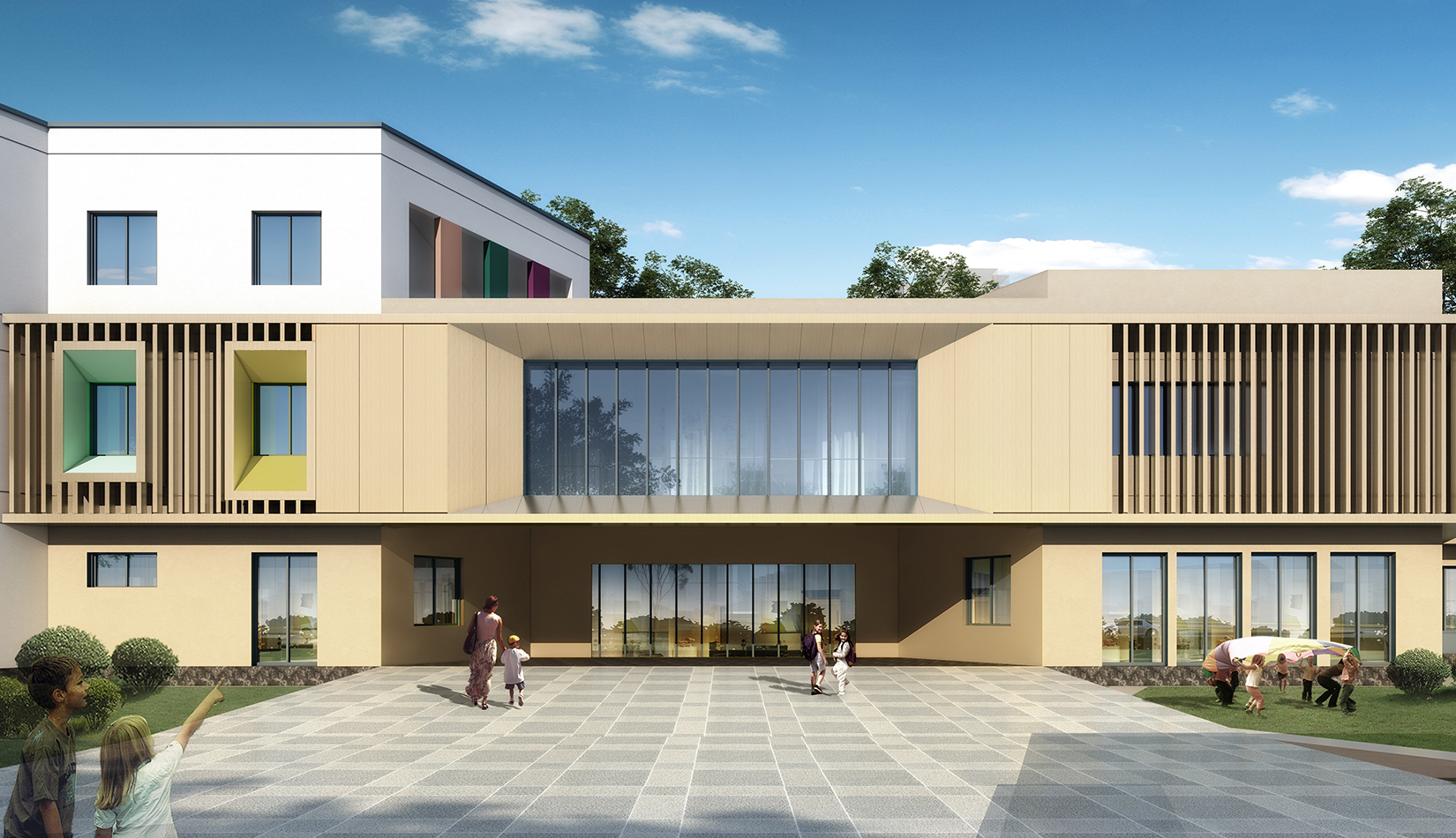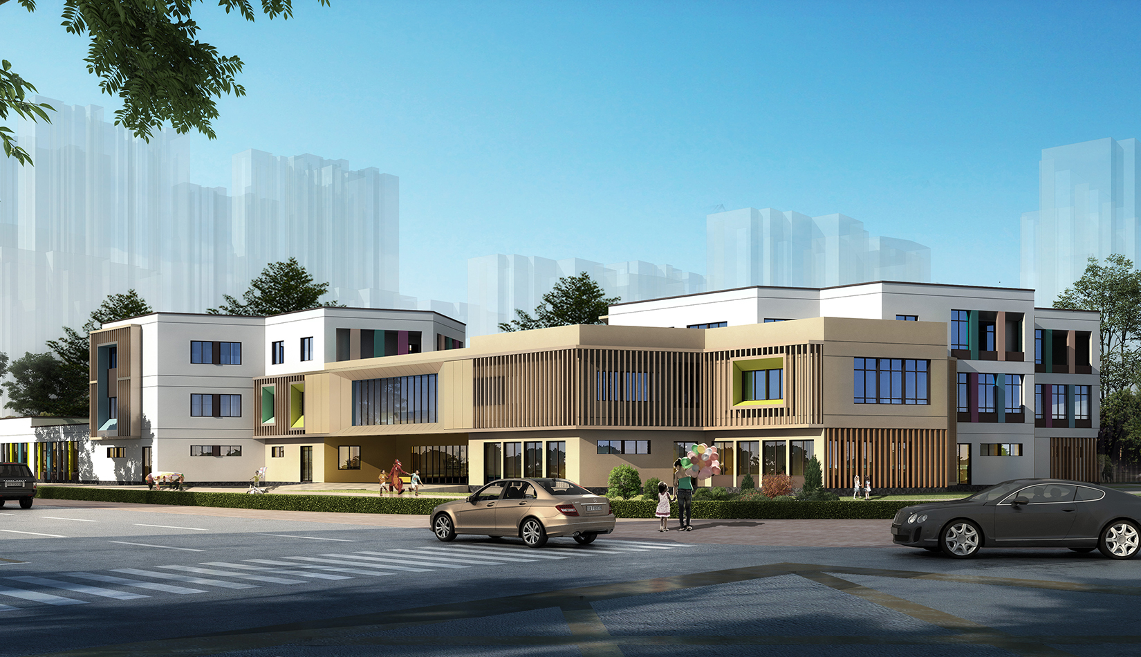 整體建筑以暖色調(diào)為主,旨在為幼兒營造一種溫馨的環(huán)境氛圍,以紅色陶土板為基調(diào),與周邊古典風格的住宅區(qū)相融合。彩色的運用象征著孩子活潑多彩的個性,迎合了孩子對色彩的敏感特性,營造出一種五彩斑斕的活潑的環(huán)境氛圍;彩色具有強調(diào)作用,可以突出建筑作為幼兒園的功能性,同時白色作為整體環(huán)境的基調(diào)色,協(xié)調(diào)了不同色彩間的沖突感受,使建筑氛圍呈現(xiàn)簡潔明凈而又突顯夢幻的特點。