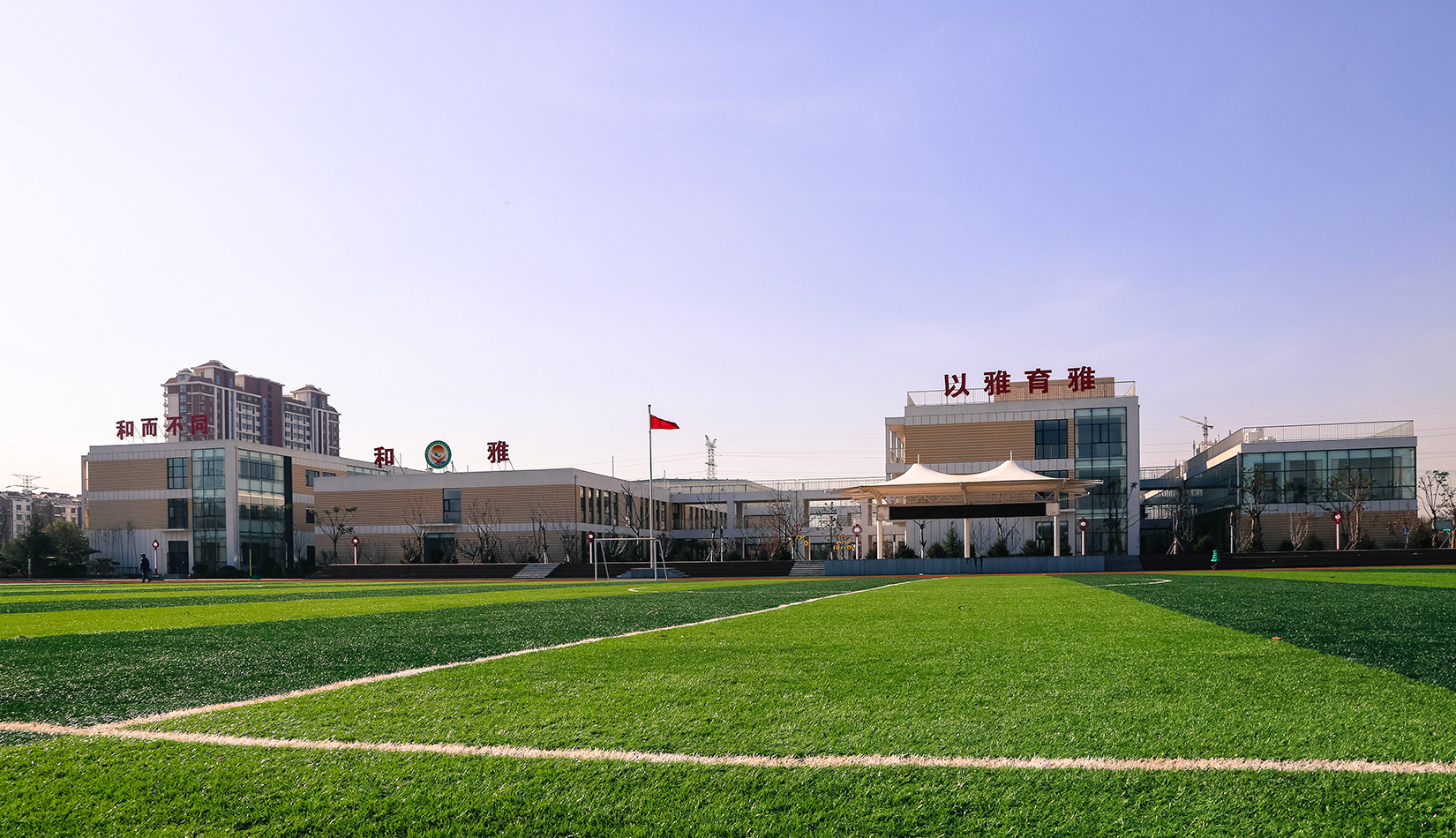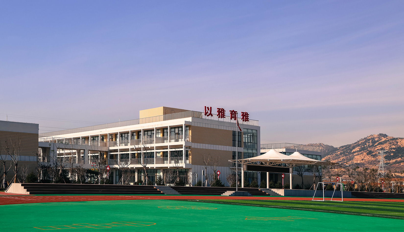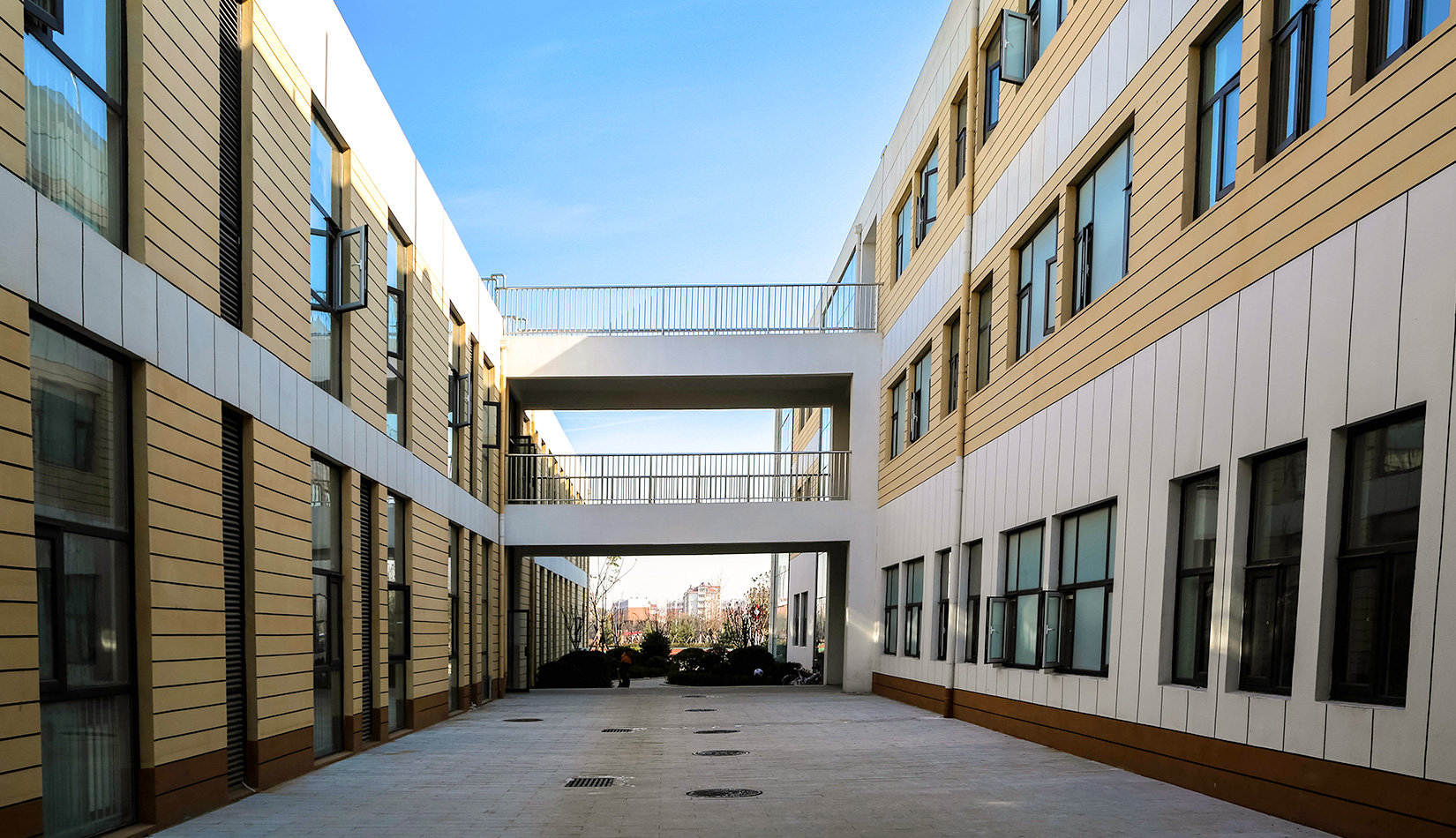 該項目通過幾個建筑單體與架空走廊的穿插連接將整個校區(qū)有機聯(lián)系起來,實現(xiàn)了建筑功能的整體性,完善了建筑可達(dá)性。形成的中庭空間可成為交流為主的平臺,營造了學(xué)習(xí)、活動為一體的校園氛圍。建筑外立面以簡潔的現(xiàn)代風(fēng)格為主,同時表現(xiàn)校園文化,主要采用黃色與白色真石漆形成色彩對比,在教室南立面、樓梯間、就餐區(qū)等采用整體通透的玻璃幕墻與實墻形成虛實對比,形成簡潔而不失活潑的建筑風(fēng)格。利用借景等手法進行室外綠化設(shè)計,整體打造一個高品質(zhì)的學(xué)校環(huán)境。