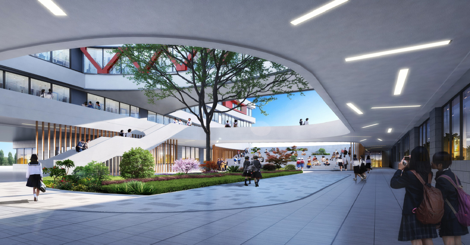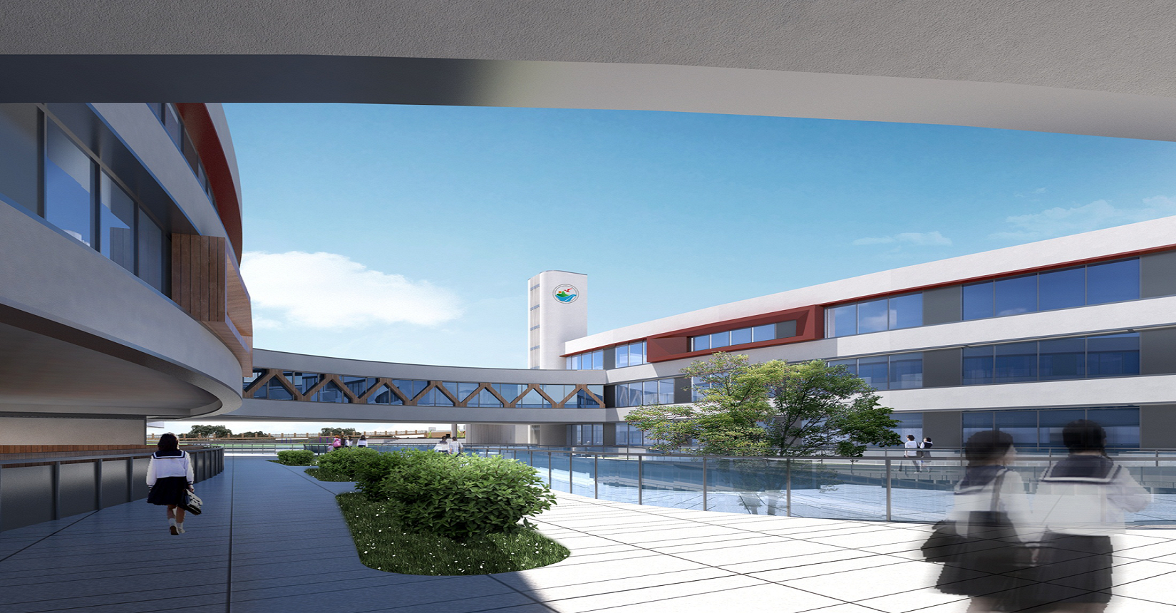 校園規(guī)劃采用曲線手法,營(yíng)造流水姿態(tài),將東側(cè)山脈與西側(cè)河流連接在一起。設(shè)計(jì)現(xiàn)代化“山水”校園,使學(xué)生在自然中成長(zhǎng)。營(yíng)造活水發(fā)源的“源頭”意境,寓意教育為人類(lèi)文化長(zhǎng)河的源頭,呼應(yīng)學(xué)?!霸搭^”文化。曲線舒展的形體,整體采用白色色調(diào),局部以紅黃色進(jìn)行點(diǎn)綴,風(fēng)格純潔又不失活潑。